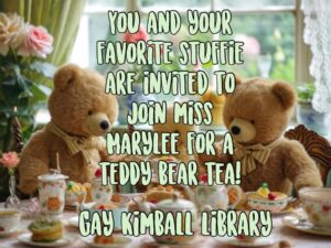 Join us for a fun, educational, high society tea! Bring your favorite stuffie and dress your best! This event is free and open to boys and girls of all ages from the Gay-Kimball Library! It will include a story, snacks, and other suprises!