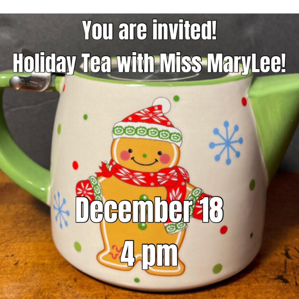 HOLIDAY TEA WITH MISS MARY LEE: Thursday, Dec. 18 at 4 pm. Holiday themed, wear your best holiday gear and bring a stuffie along to celebrate the season! This event is suitable for any age but geared at younger children. A snack and craft will be provided!