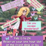 | 14Alice in Wonderland Escape RoomAlice in Wonderland Escape Room Join us for our new escape room that follows Alice down a wild rabbit hole of adventure! This is a free event but registration is required to save your spot! Suitable for kids 10 to adult.
