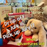 | 17Stuffy SleepoverStuffy Sleepover On July 16th, bring in your stuffy friend at any time during the day to have their very own sleepover overnight at the library! Then on July 17th, come back to the library to see what amazing adventures they had at the library and have a picnic snack with your stuffy friend! Hopefully they don't get into too much mischief!