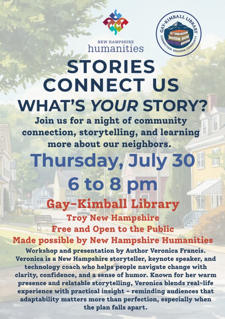 TROY, NH- Gay-Kimball Library has received a Civic Life and Belonging grant from New Hampshire Humanities to present “What’s Your Story?” “What’s Your Story” will occur on July 30 from 6 to 8 pm at Gay-Kimball Library in Troy, New Hampshire.